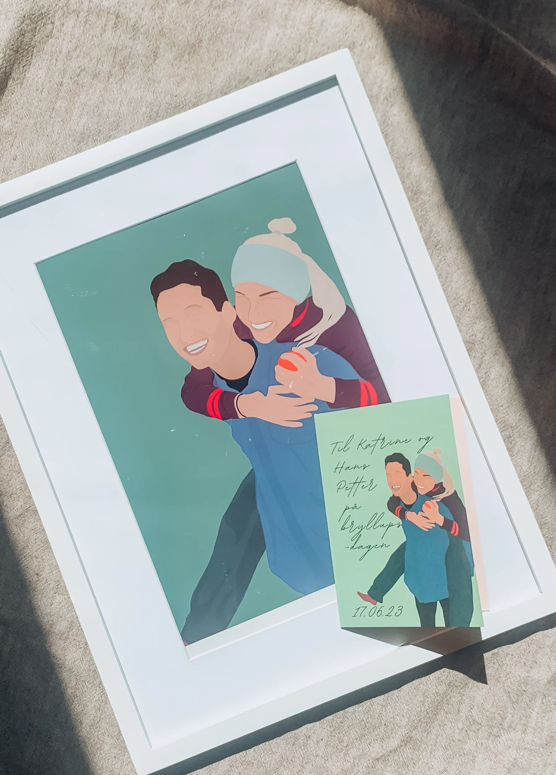 Med teikning av brureparet og mulighet til å egge inn tekst og foto.