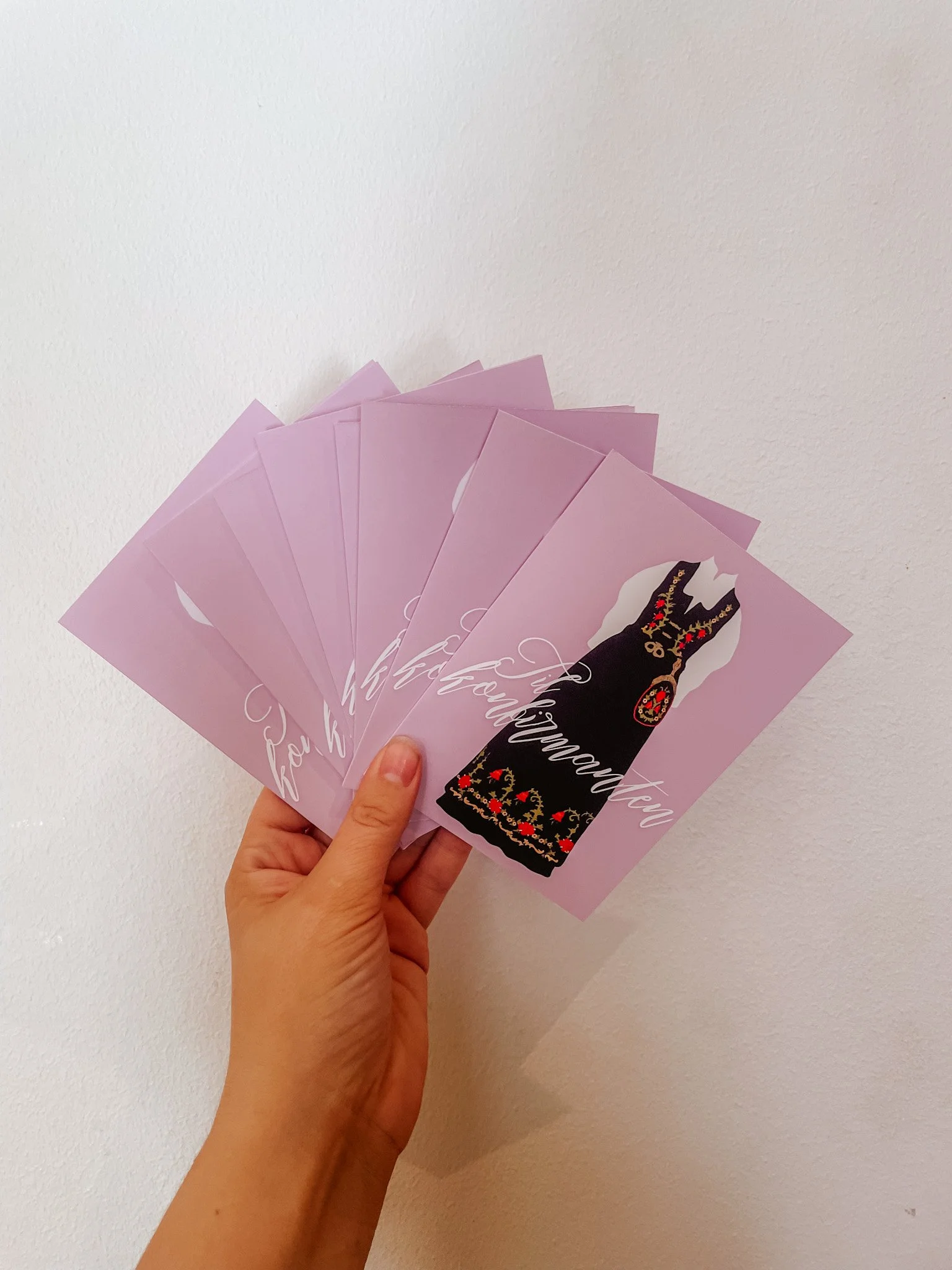 Bittesmå kort som leverast i to variantar: Ein fikranta og ein so følger forma til bunaden. Kjem utan tekst og kan består av valgfri bakgrunnsfarge og din favorittbunad.